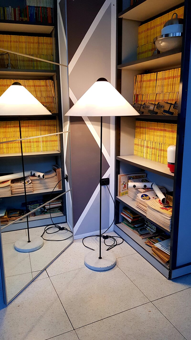 Sintesi di eleganza e semplificazione questa famiglia di lampade a luce diretta e diffusa si basa sulla composizione di un cono in metacrilato e di una sfera metallica verniciata in nero: il cono si appoggia per gravità, senza l’uso di viti, alla sfera che a sua volta sostiene il portalampada. La forma che ne risulta ricorda, per il modello a sospensione, le vecchie lampade verdi inglesi delle sartorie. Il metacrilato è sempre in finitura opale. La sospensione si reggeva sul solo cavo elettrico, anch’esso nero. Pattera semisferica appositamente disegnata in metallo nero e successivamente in PVC. Nel 2007 il modello a sospensione (401) è rieditato, in accordo con gli eredi Magistretti, con una dimensione di 92 cm richiesta ai tempi da Vico Magistretti, ma allora tecnicamente non realizzabile. Il modello da terra (301 C/P) presentava inizialmente una tige in acciaio con finitura nichel spazzolato e una base conica in metallo con fodera in metacrilato opale, in seguito la tige sarà in metallo laccato nero e la base o conica o cilindrica in marmo bianco; quello da tavolo (201) modificava la lunghezza della tige e presentava da subito una struttura in metallo laccato nero su base in marmo bianco ed elettrificazione con due lampadine. Le lampada da tavolo e da terra utilizzavano due imballi (uno esclusivamente per il diffusore), la sospensione un unico imballo.