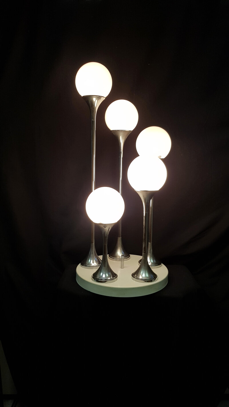 Lampada design by Targetti Sankey anni 70 con tripla accensione perfettamente funzionante come da foto con cromature non perfette. Disponibile anche per il noleggio (studi televisivi, foto cataloghi, moda, sfilate, studi cinematografici) Si prega di inviare una mail o telefonare prima dell’acquisto, perché è in vendita anche su altri siti o potrebbe essere stata noleggiata.