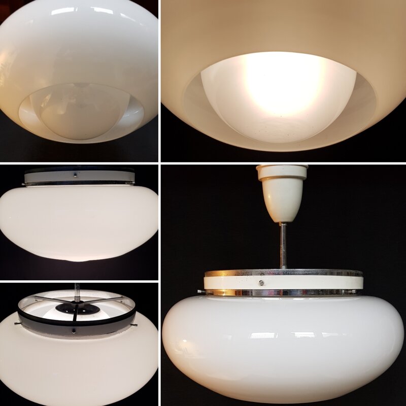 lampadario di design in vetro opalino (si accenda sia la calotta superiore, sia quella inferiore). Si prega di inviare una mail o telefonare prima dell’acquisto, perché i prodotti sono vendita anche su altri siti o potrebbero essere stati noleggiati.